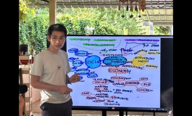 Un villageois de Mae Tha expliquant l'histoire et le cadre du système d'agriculture biologique du village. (Photo fournie à CSST)